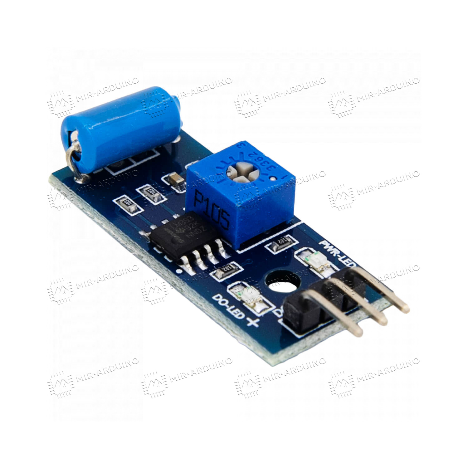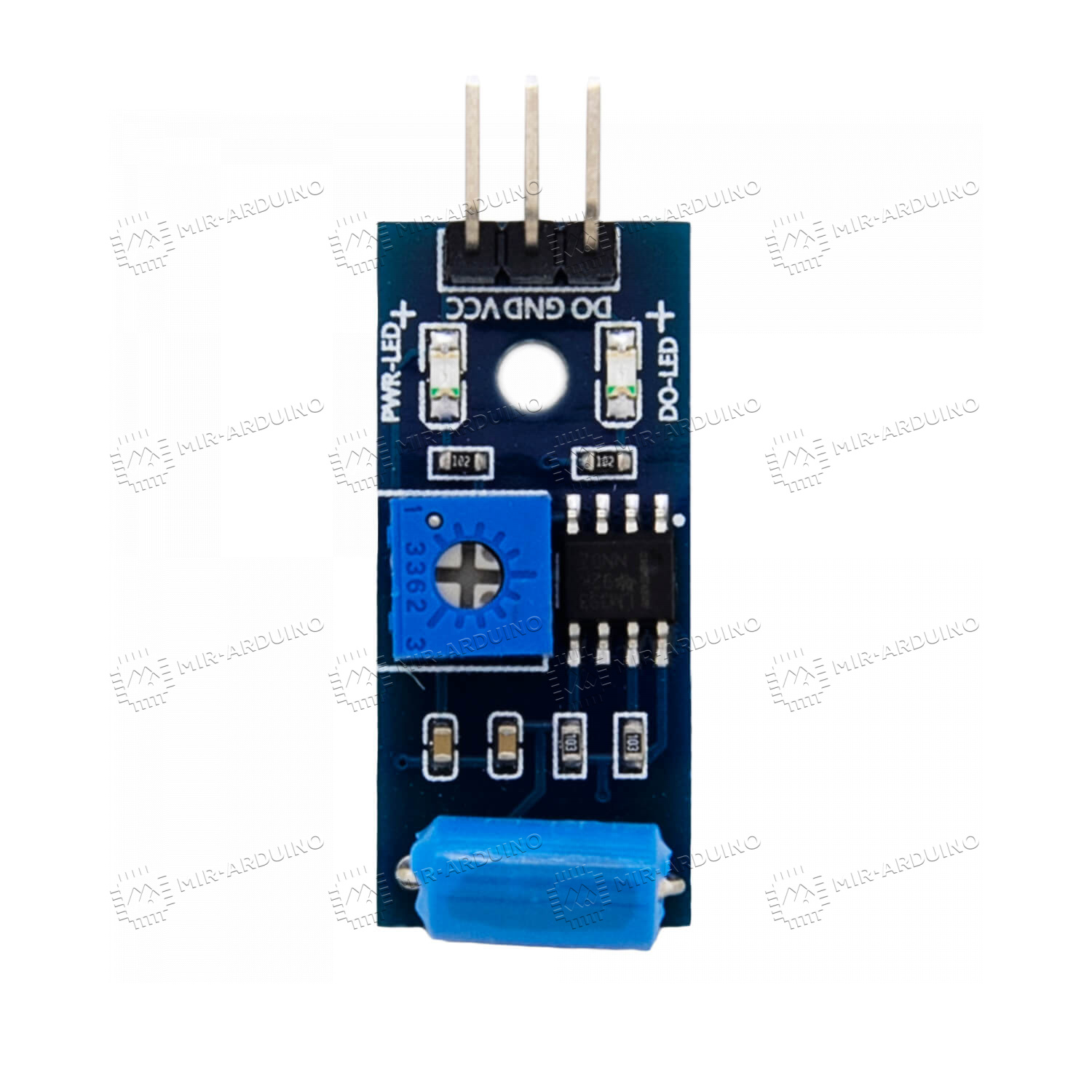 Датчик вибрации (удара) SW-420 используется в проектах, построенных на базе платформы Ардуино. Может применяться для создания сигнализационных и автоматических систем. Датчик представляет собой модуль, на котором размещена сжатая пружина в металлическом корпусе. Она реагирует на вибрации или удары путем кратковременного замыкания контактов. Также на плате есть потенциометр, который позволяет установить порог срабатывания датчика. Предусмотрен встроенный светодиодный индикатор.