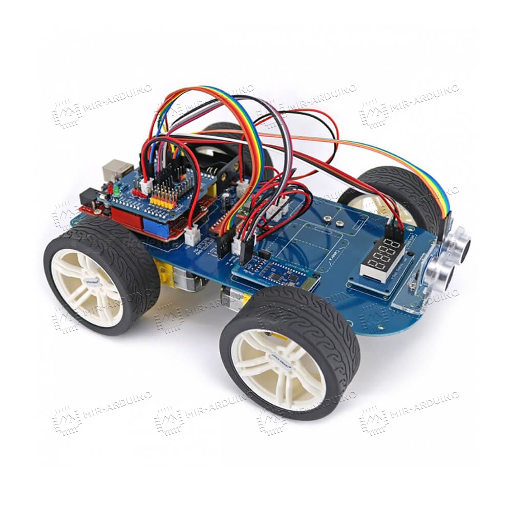 Набор для моделирования Ардуино (Arduino) 4WD Smart Car поможет собрать машинку на пульте управления. Умный конструктор используется для обучения азам робототехники и программирования, подойдет как для новичков, так и для опытных инженеров. Робот-автомобиль работает от платы Arduino UNO, которая входит в набор. Собранным устройством можно управлять с помощью пульта либо смартфона через Bluetooth модуль. Машина может передвигаться по разным траекториям, объезжать препятствия, следовать за объектом. При желании можно расширить функционал робота путем установки дополнительных модулей и датчиков.
